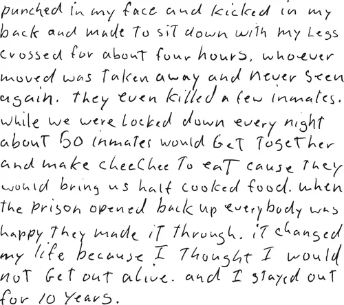Each serving of cheechee at Kitchen of Corrections is accompanied by a booklet of stories written by returning citizens about their experiences in prison. Below is a sample of one such story contributed by LaMark Foster.